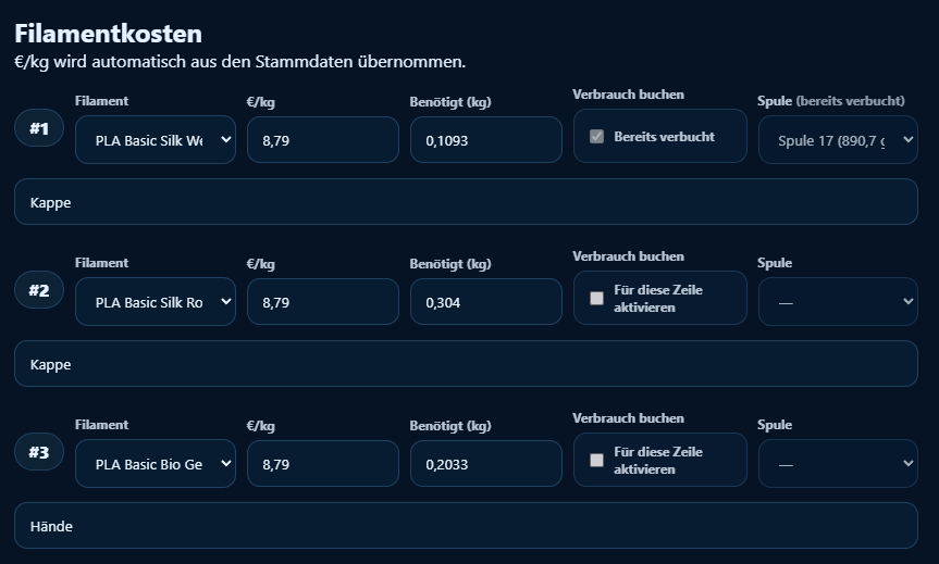 Durch diese Erweiterungen wird die Druckkosten-Kalkulation deutlich stärker mit der Filament-Verwaltung verzahnt. Anwender profitieren von einer automatisierten Materialbuchung, höherer Transparenz und einer deutlich besseren Nachverfolgbarkeit ihrer Produktionskosten. Gleichzeitig bildet diese Integration die technische Grundlage für zukünftige Funktionen wie automatische Projektstatistiken, Materialauswertungen oder präzisere Produktionsreports.